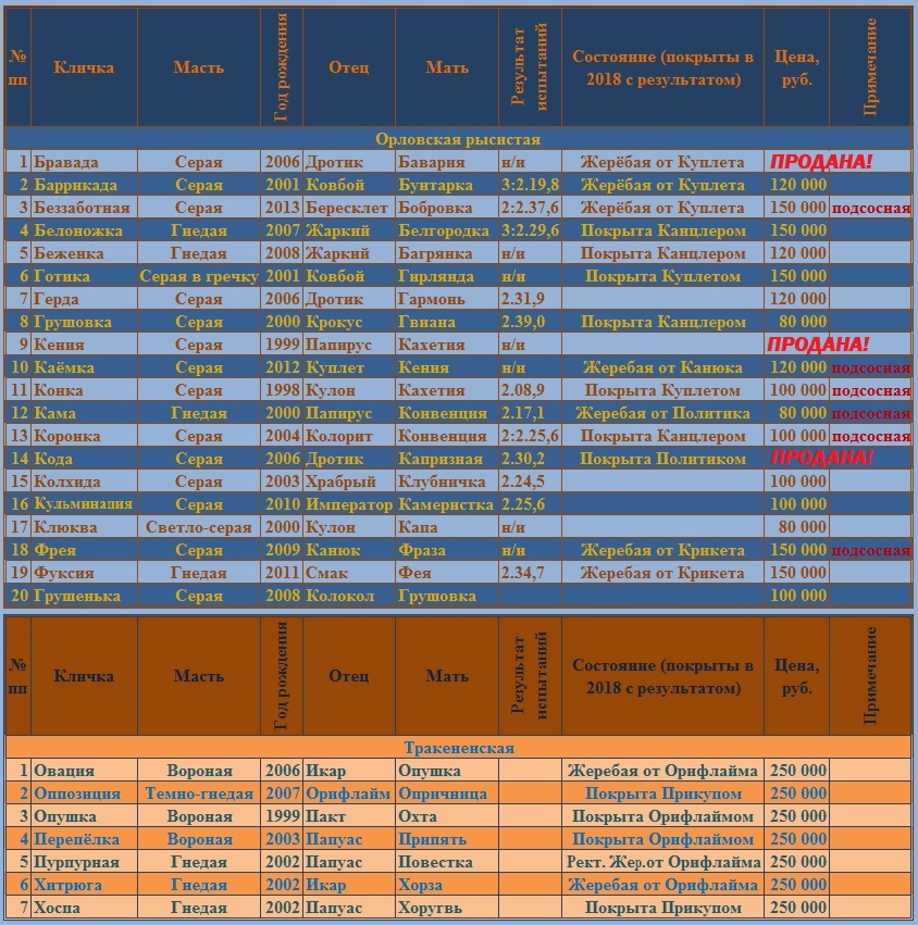 Home Продажа маточного поголовья 31.05.2018 Продажа маточного поголовья В связи с оптимизацией и обновлением маточного состава предлагаются к продаже заводские кобылы, в том числе жерёбые от лучших жеребцов-производителей! Возврат к списку